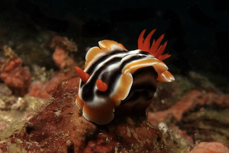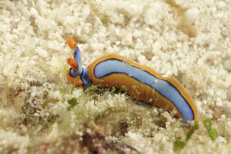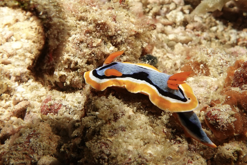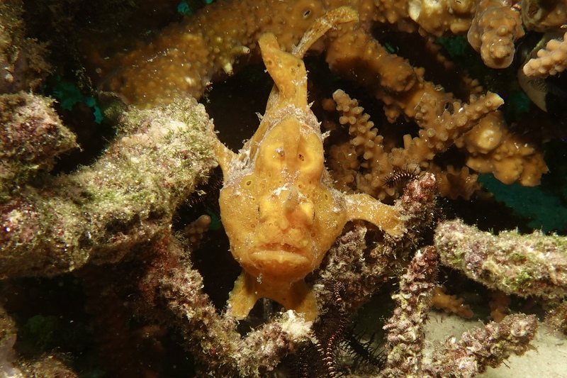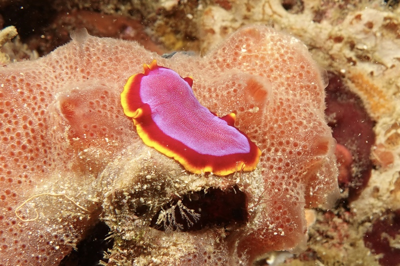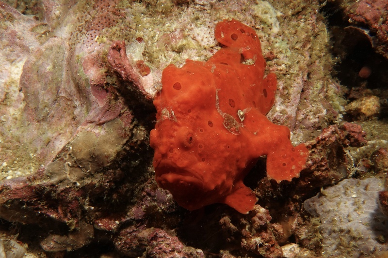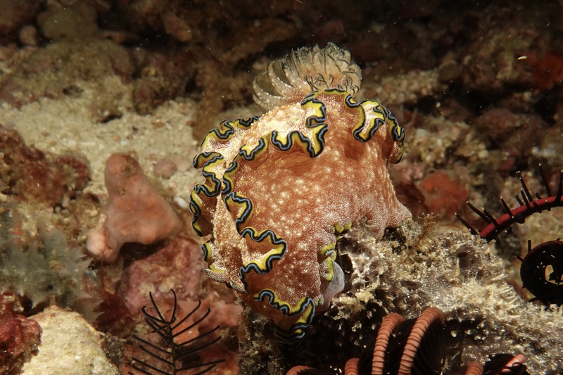 Das Wetter bessert sich die ganzen zwei Wochen nicht wirklich, einen einzigen sonnigen Tag mit knallblauem Himmel nutze ich für die Ausfahrt nach Gato Island, das bereits aus der Ferne als gewaltige, schroffe, grün bewachsene Felsenkuppel am Horizont glänzt. Dort dösen Weißspitzenriffhaie in Überhängen, während sich davor schwarz-weiß gestreifte Seekobras durch die Riffblöcke schlängeln. Ein grellroter Anglerfisch hockt wie eine kleine Kartoffel reglos am Boden und beobachtet das Treiben. Sepien, Geisterpfeifenfische, pinke, blau-gelbe, rot-weiße Schnecken, Seesterne in blau, gelb-rot, geometrisch gemustert, Schnecken mit einem Saum wie eine Flamenco Tänzerin, himmelblaue Plattwürmer – es ist wie bei Alice im Wunderland.