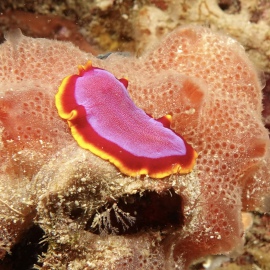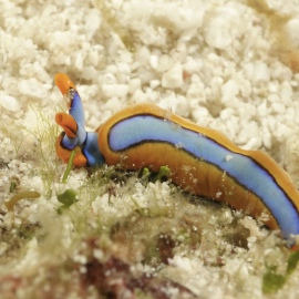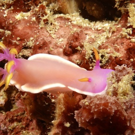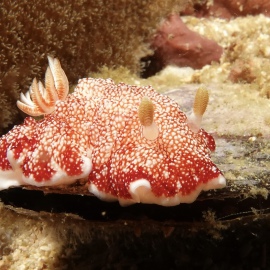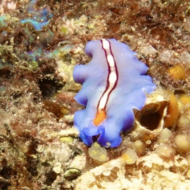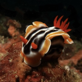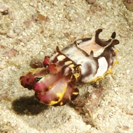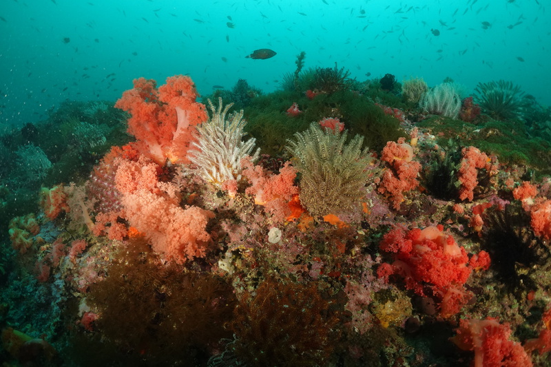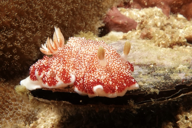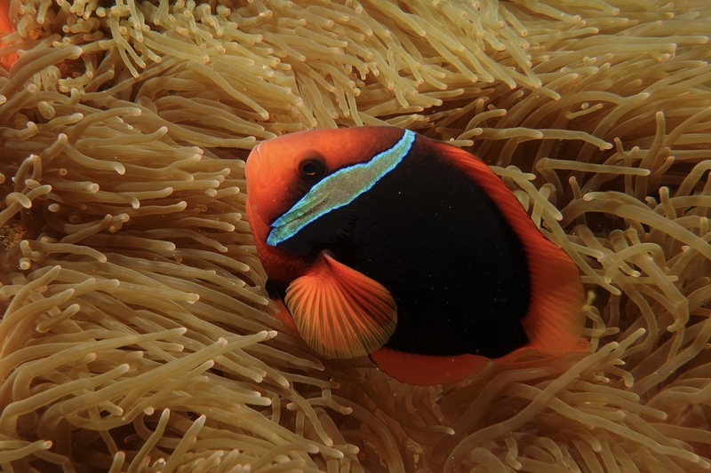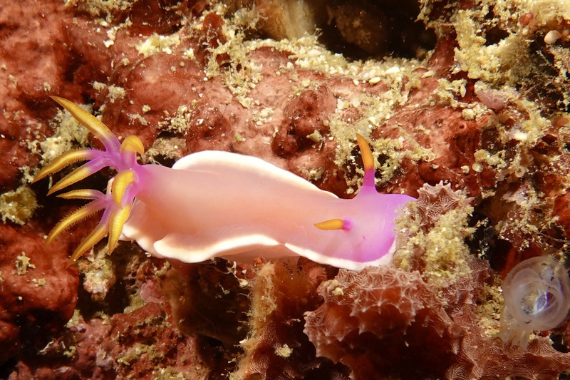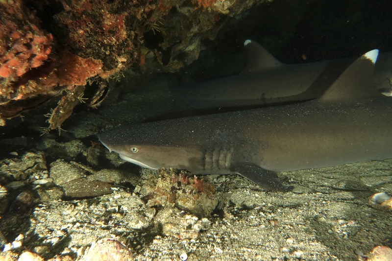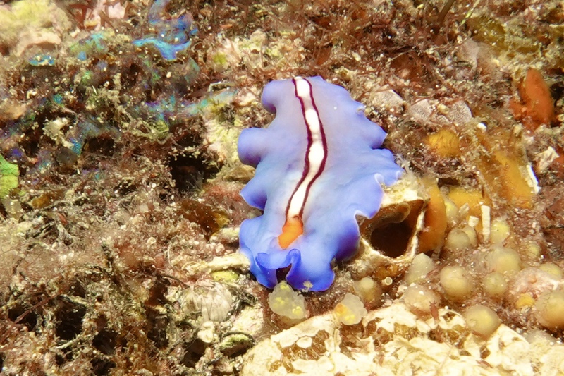 Das Wetter bessert sich die ganzen zwei Wochen nicht wirklich, einen einzigen sonnigen Tag mit knallblauem Himmel nutze ich für die Ausfahrt nach Gato Island, das bereits aus der Ferne als gewaltige, schroffe, grün bewachsene Felsenkuppel am Horizont glänzt. Dort dösen Weißspitzenriffhaie in Überhängen, während sich davor schwarz-weiß gestreifte Seekobras durch die Riffblöcke schlängeln. Ein grellroter Anglerfisch hockt wie eine kleine Kartoffel reglos am Boden und beobachtet das Treiben. Sepien, Geisterpfeifenfische, pinke, blau-gelbe, rot-weiße Schnecken, Seesterne in blau, gelb-rot, geometrisch gemustert, Schnecken mit einem Saum wie eine Flamenco Tänzerin, himmelblaue Plattwürmer – es ist wie bei Alice im Wunderland.