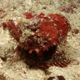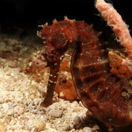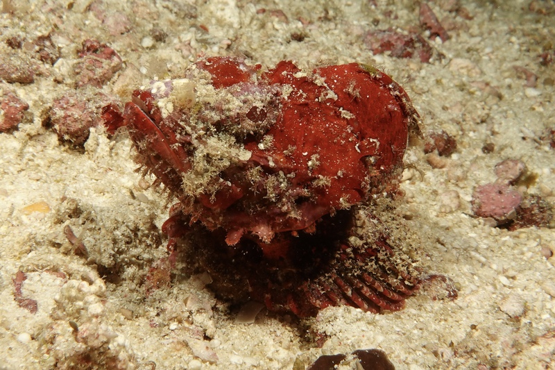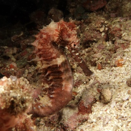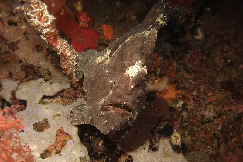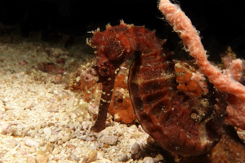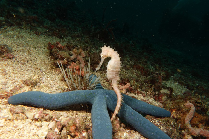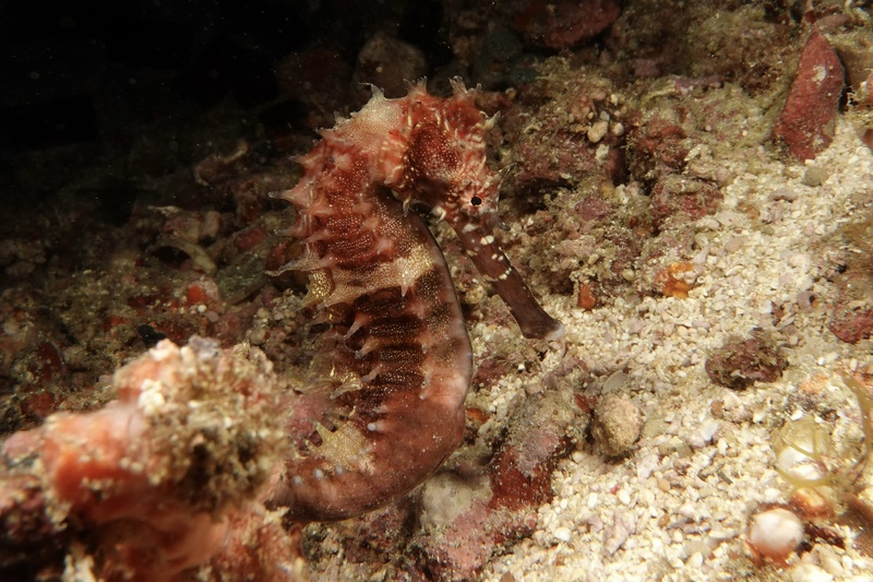 Bei Dakit Dakit finden wir Seepferdchen ohne Ende, schwangere Kerle und zauberhafte, helle weibliche Exemplare; ein grellroter Skorpionsfisch starrt ins Nichts, gepunktete Plattwürmer ziehen über den Grund.