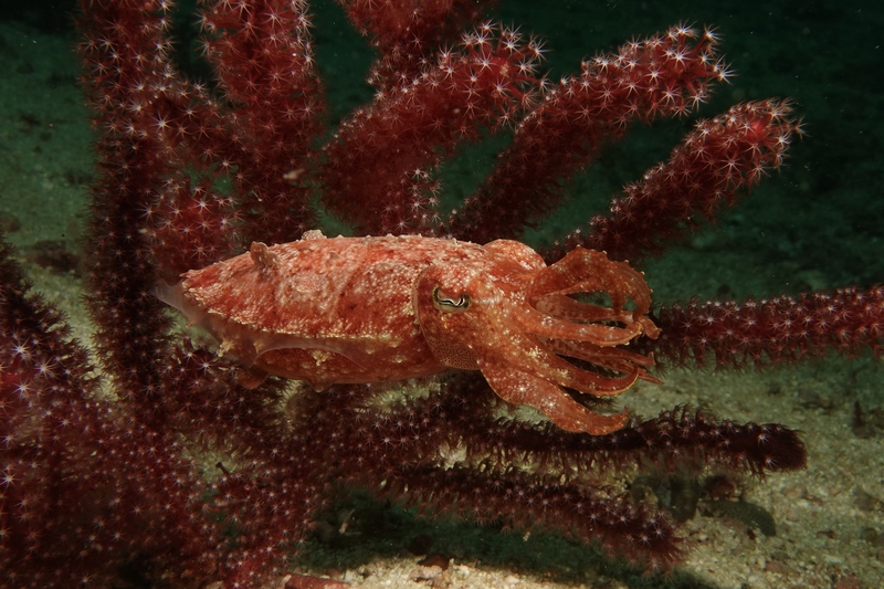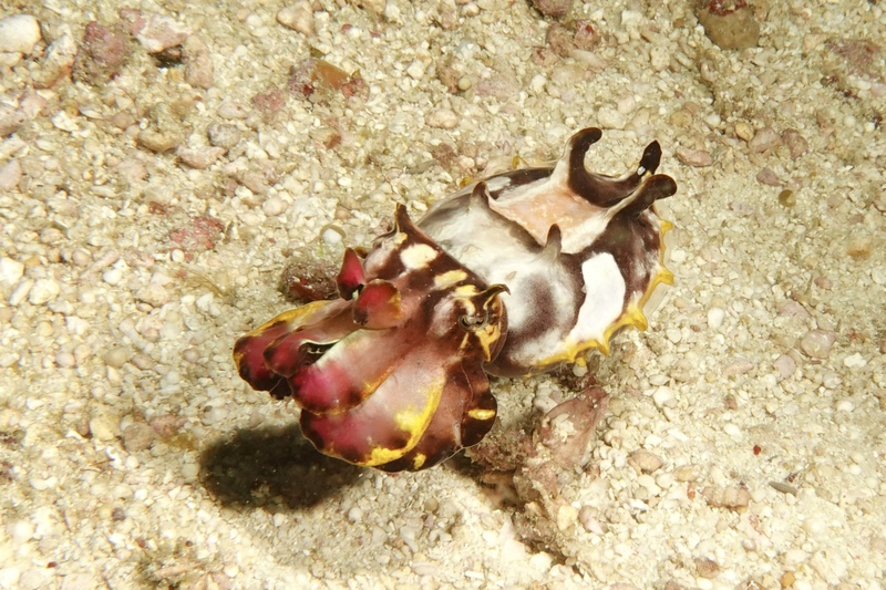 (Fast) jeder Tauchgang ist ein Höhepunkt: Die possierlichen Mandarinfische am Evo Riff, Anglerfische, Schnecken, Pygmäenseepferdchen, durchscheinende Shrimps, Seenadeln, eine herrlich leuchtende Prachtsepie.