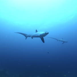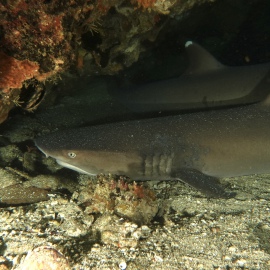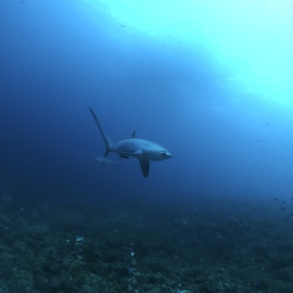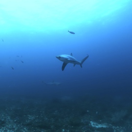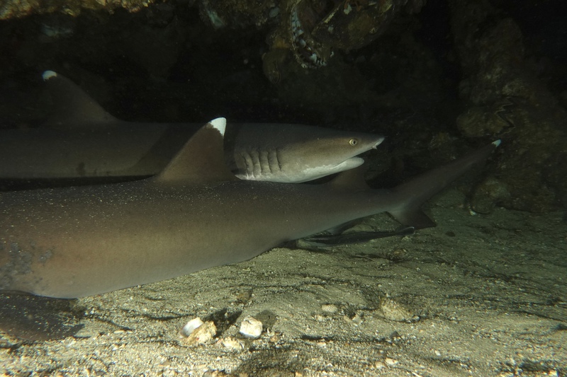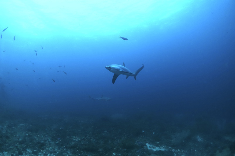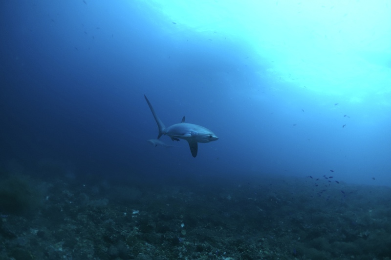 Unter Wasser jedoch ist der Garten Eden erhalten geblieben, fast noch üppiger und verschwenderischer als je zuvor! Die Fuchshaie haben die Adresse gewechselt und sind von Monad Shoal nach Kimud Shoal umgezogen. Wie graue, seidig glänzende Geister mit riesigen schwarzen Augen und einem immer geöffneten Maul gleiten die Tiere über die üppigen Weichkorallen am Plateau und lassen sich von dutzenden Mondsichellippfischen putzen. Ein gelb-roter Warzenanglerfisch hockt unter dem Schirm einer Steinkoralle, zwei Oktopusse turnen an der Mooring Leine. Die Kugelfische, Skorpionsfische und Muränen beachtet hier niemand, alle beobachten die eleganten Fuchshaie mit ihrer langen Schwanzflosse, die sie wie einen Wimpel hinter sich herziehen.