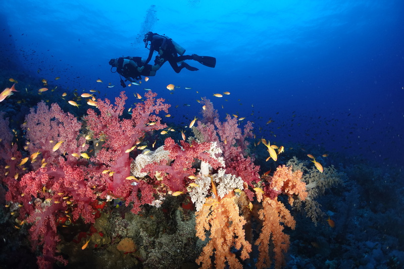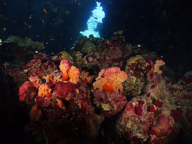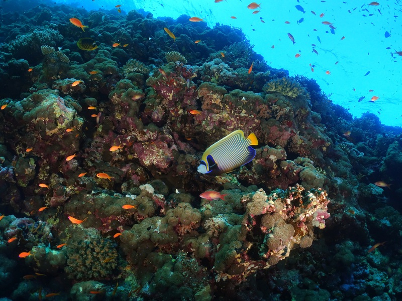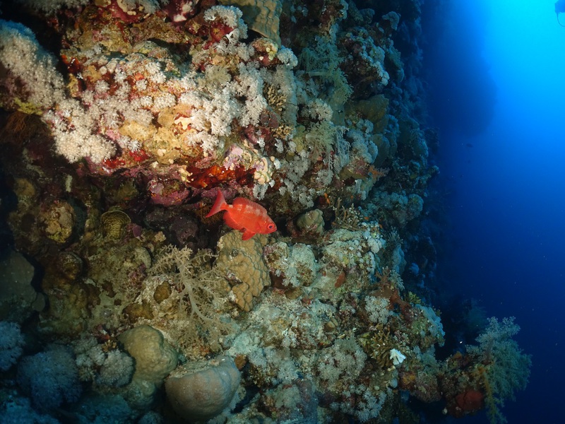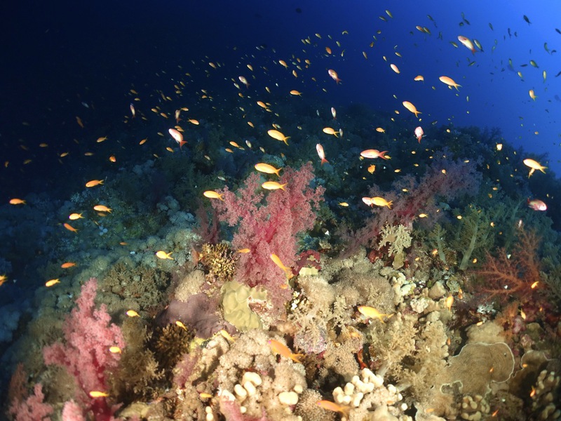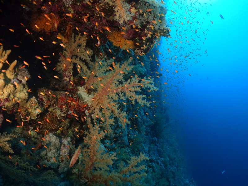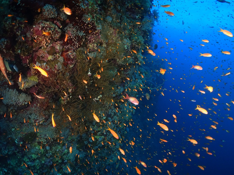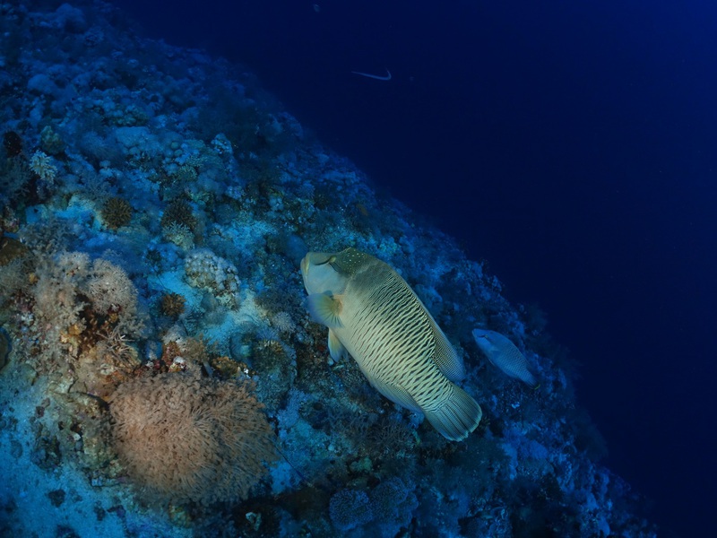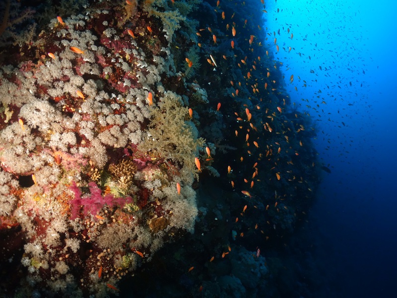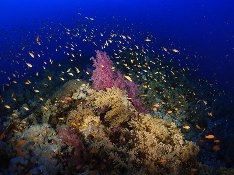 Natürlich besuchen wir auch die ungekrönte Prinzessin der Gegend: Elphinstone. Wohl aufgrund der Jahreszeit und auch der allgemeinen Lage sind wir das einzige Boot am Platz, nur drei Tauchgäste teilen sich den wundervollen Ort an diesem Tag. Am Nordplateau wuchert ein Märchenwald aus weißen, pinken und lila Weichkorallen zwischen denen orange Fahnenbarsche wie Schmetterlinge umherschweben, ein paar rote Juwelenbarsche kreuzen von links und rechts. Eine Explosion der Farben, die ganze Palette des Regenbogens im glasklaren durscheinenden Blau. Ein Napoleon knackt eine Muschel während ein kleineres Exemplar neben ihm herschwimmt. Eine Karettschildkröte betätigt sich als Gärtner und stutzt den üppigen Weichkorallenbewuchs. Die herrliche steile Wand entlang, der wir Richtung Süden folgen, begegnen uns Riesenmuränen, zitronengelbe Falterfische, grell rote Großaugenbarsche. Flötenfische tanzen, alle in dieselbe Richtung ausgerichtet, ein Ballett für uns. Am Ende der Wand finden wir das mit hellen Weichkorallen überwucherte Südplateau. Die ansonsten häufig zu Gast weilenden Weißspitzen Hochseehaie sind an diesem Tag allerdings abwesend. Trotz der Eiseskälte (es ist Jänner) wiederhole ich diesen Tauchgang insgesamt vier Mal.