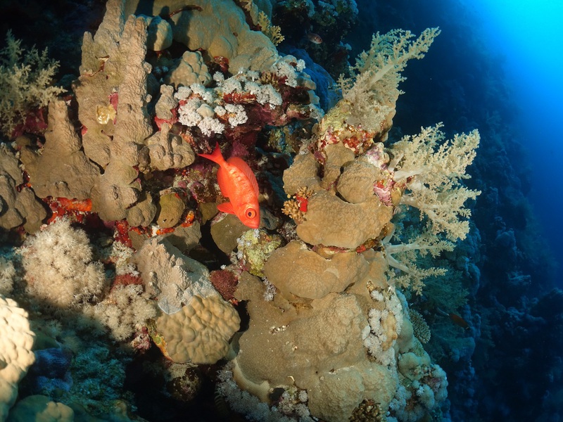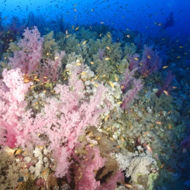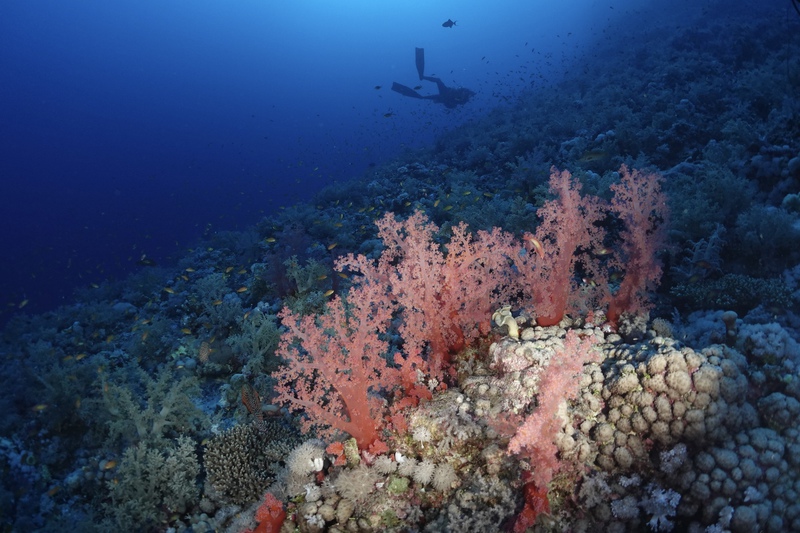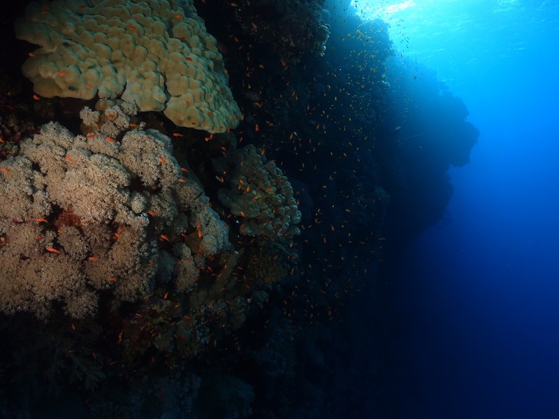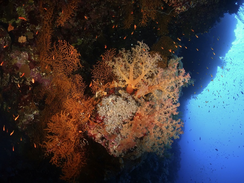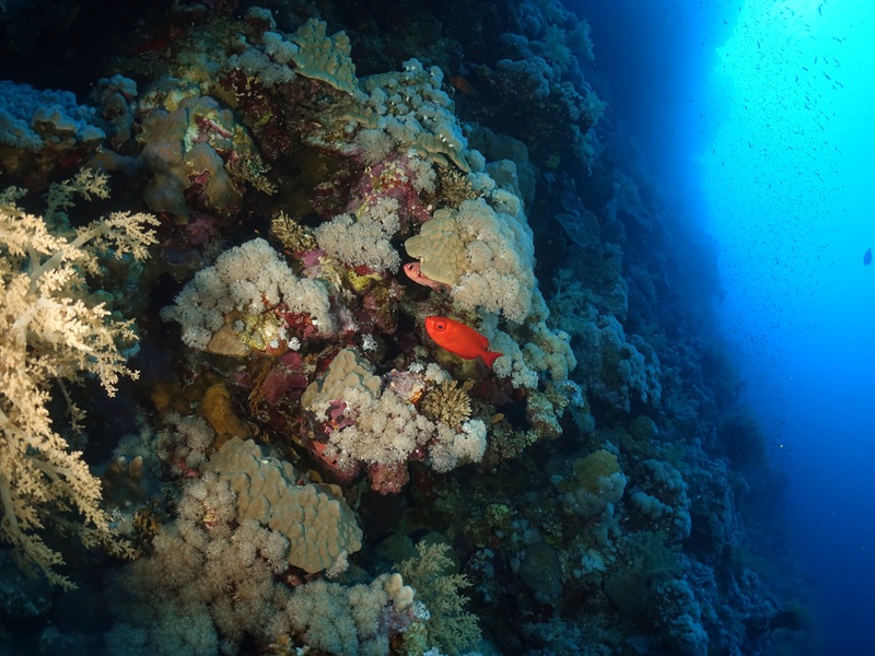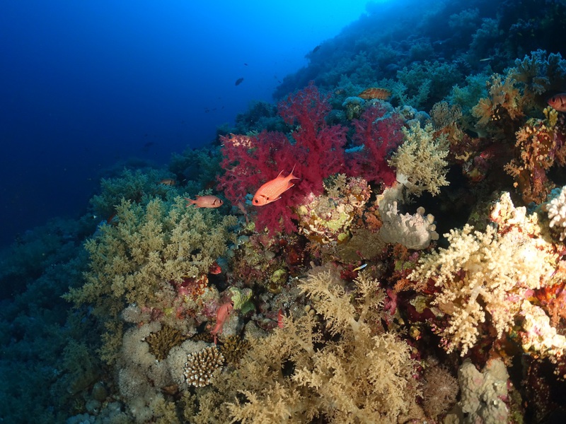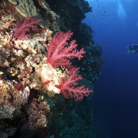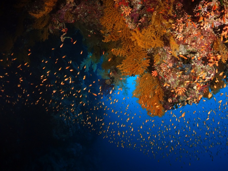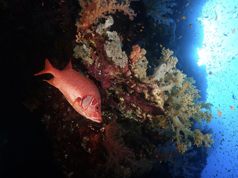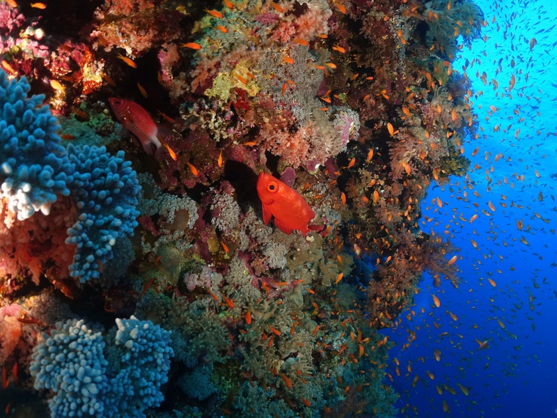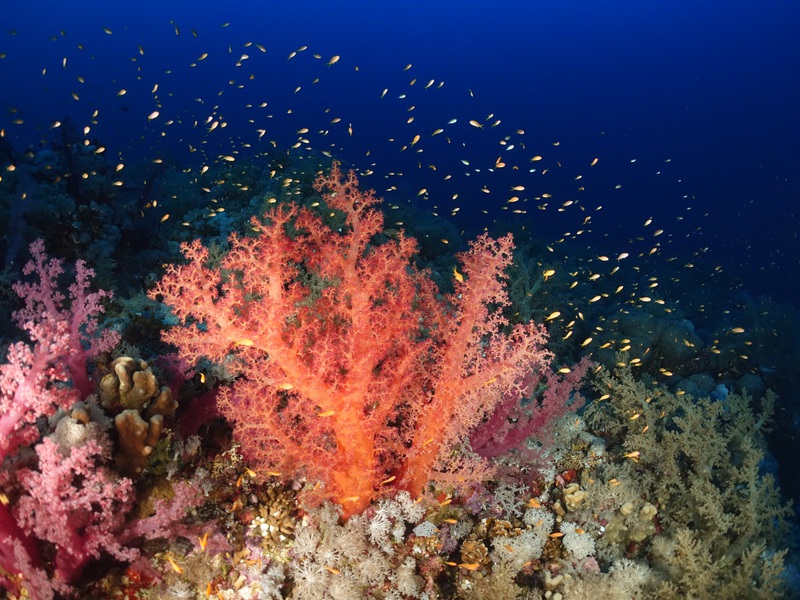 Natürlich besuchen wir auch die ungekrönte Prinzessin der Gegend: Elphinstone. Wohl aufgrund der Jahreszeit und auch der allgemeinen Lage sind wir das einzige Boot am Platz, nur drei Tauchgäste teilen sich den wundervollen Ort an diesem Tag. Am Nordplateau wuchert ein Märchenwald aus weißen, pinken und lila Weichkorallen zwischen denen orange Fahnenbarsche wie Schmetterlinge umherschweben, ein paar rote Juwelenbarsche kreuzen von links und rechts. Eine Explosion der Farben, die ganze Palette des Regenbogens im glasklaren durscheinenden Blau. Ein Napoleon knackt eine Muschel während ein kleineres Exemplar neben ihm herschwimmt. Eine Karettschildkröte betätigt sich als Gärtner und stutzt den üppigen Weichkorallenbewuchs. Die herrliche steile Wand entlang, der wir Richtung Süden folgen, begegnen uns Riesenmuränen, zitronengelbe Falterfische, grell rote Großaugenbarsche. Flötenfische tanzen, alle in dieselbe Richtung ausgerichtet, ein Ballett für uns. Am Ende der Wand finden wir das mit hellen Weichkorallen überwucherte Südplateau. Die ansonsten häufig zu Gast weilenden Weißspitzen Hochseehaie sind an diesem Tag allerdings abwesend. Trotz der Eiseskälte (es ist Jänner) wiederhole ich diesen Tauchgang insgesamt vier Mal.