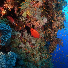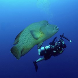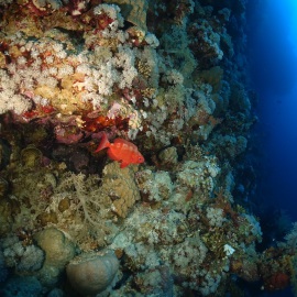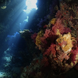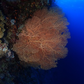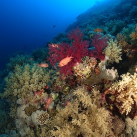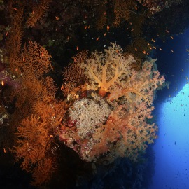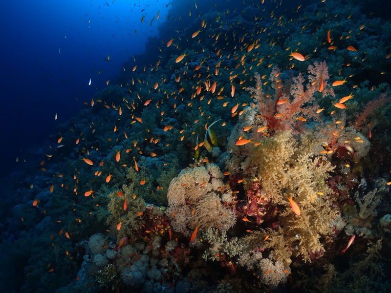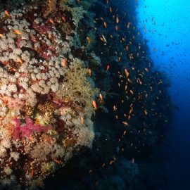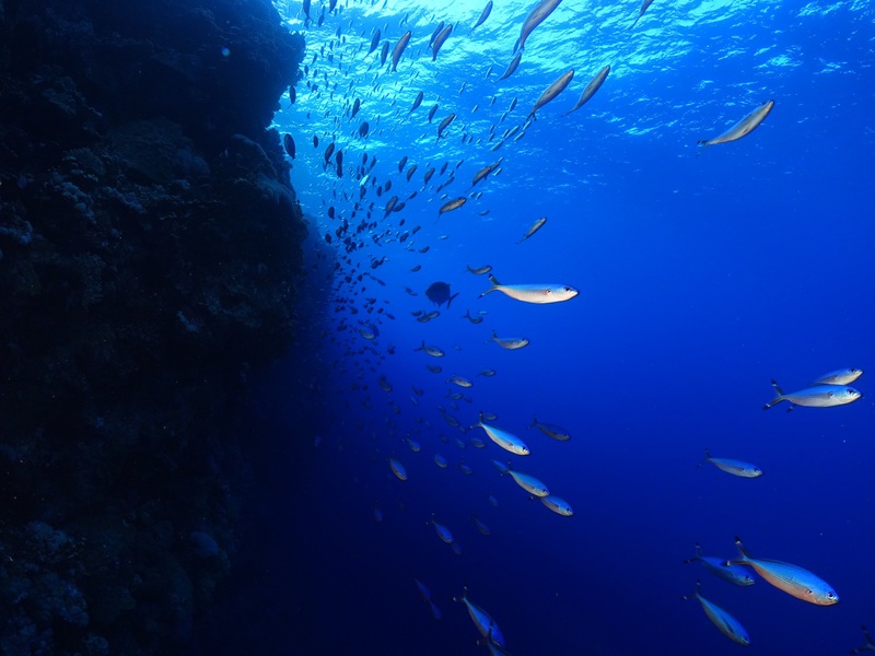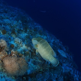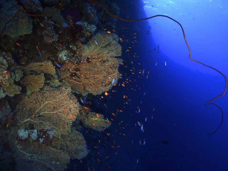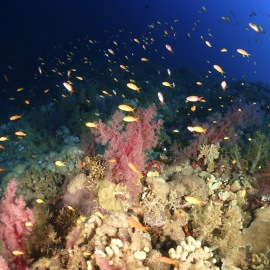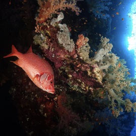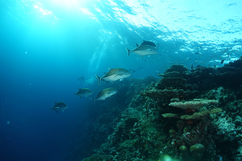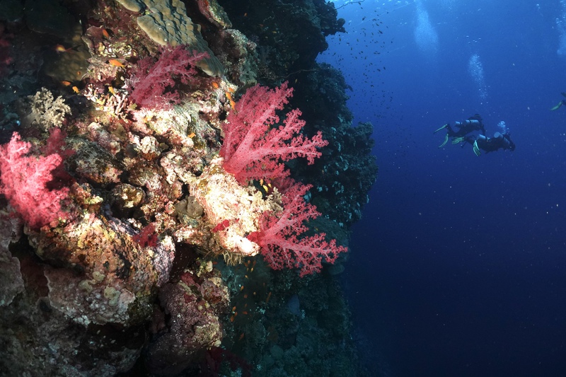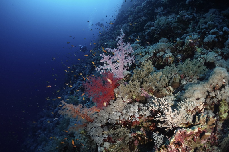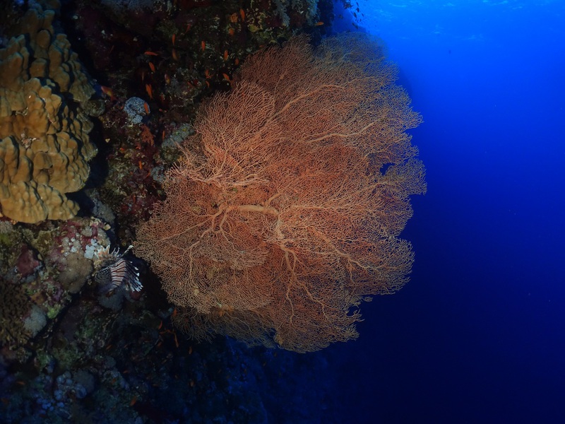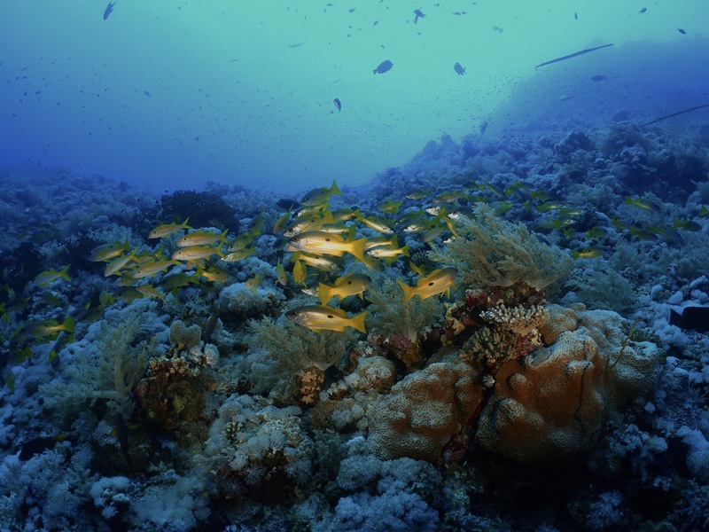 Natürlich besuchen wir auch die ungekrönte Prinzessin der Gegend: Elphinstone. Wohl aufgrund der Jahreszeit und auch der allgemeinen Lage sind wir das einzige Boot am Platz, nur drei Tauchgäste teilen sich den wundervollen Ort an diesem Tag. Am Nordplateau wuchert ein Märchenwald aus weißen, pinken und lila Weichkorallen zwischen denen orange Fahnenbarsche wie Schmetterlinge umherschweben, ein paar rote Juwelenbarsche kreuzen von links und rechts. Eine Explosion der Farben, die ganze Palette des Regenbogens im glasklaren durscheinenden Blau. Ein Napoleon knackt eine Muschel während ein kleineres Exemplar neben ihm herschwimmt. Eine Karettschildkröte betätigt sich als Gärtner und stutzt den üppigen Weichkorallenbewuchs. Die herrliche steile Wand entlang, der wir Richtung Süden folgen, begegnen uns Riesenmuränen, zitronengelbe Falterfische, grell rote Großaugenbarsche. Flötenfische tanzen, alle in dieselbe Richtung ausgerichtet, ein Ballett für uns. Am Ende der Wand finden wir das mit hellen Weichkorallen überwucherte Südplateau. Die ansonsten häufig zu Gast weilenden Weißspitzen Hochseehaie sind an diesem Tag allerdings abwesend. Trotz der Eiseskälte (es ist Jänner) wiederhole ich diesen Tauchgang insgesamt vier Mal.