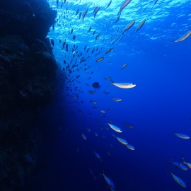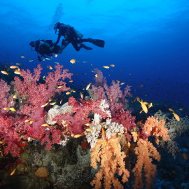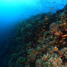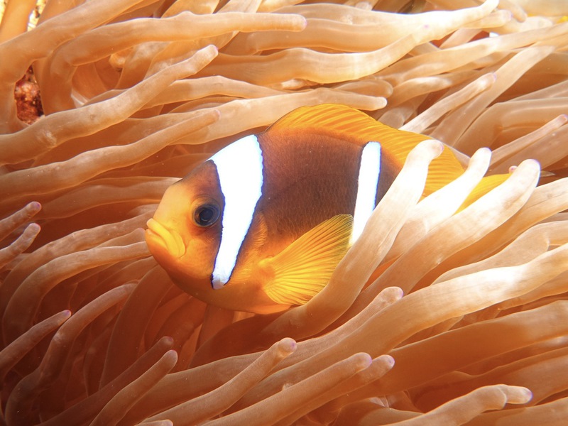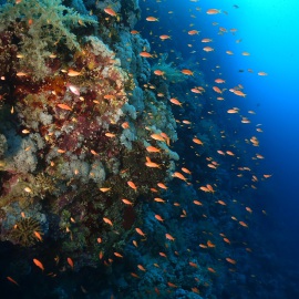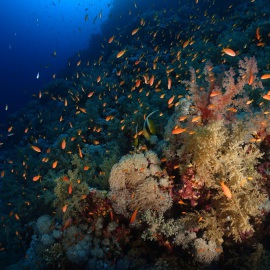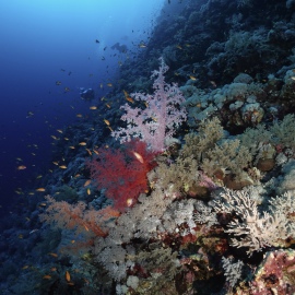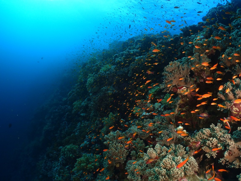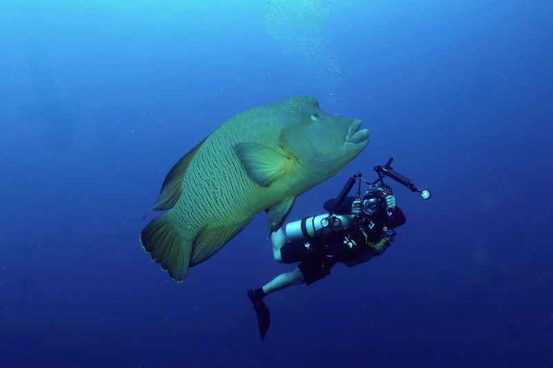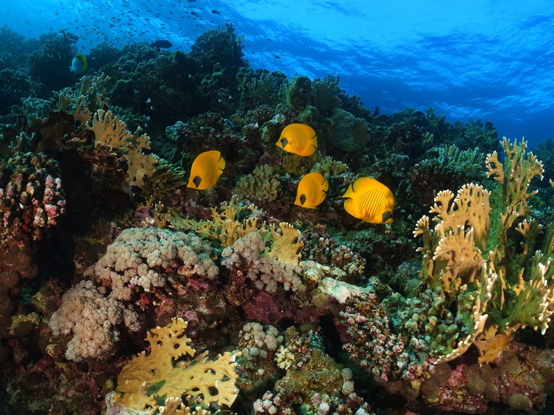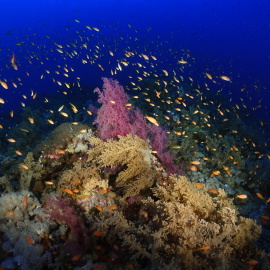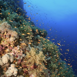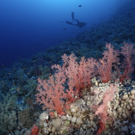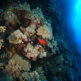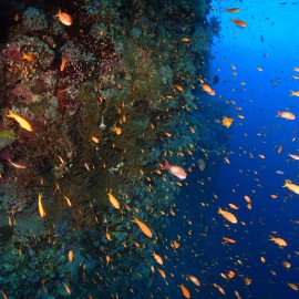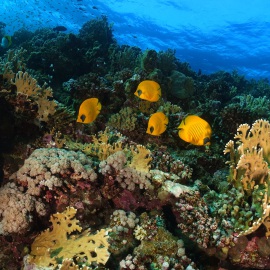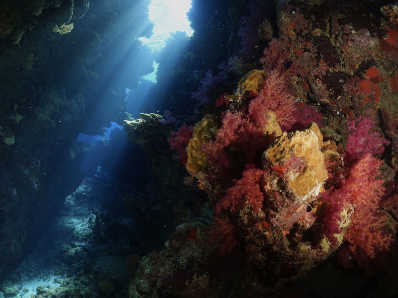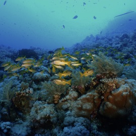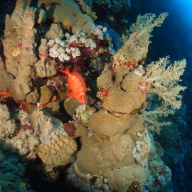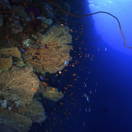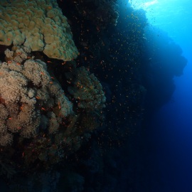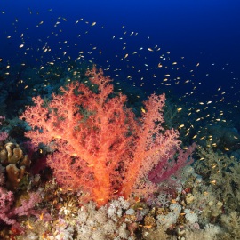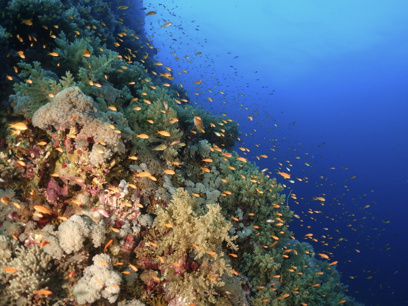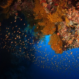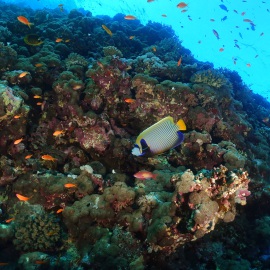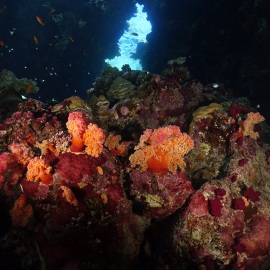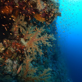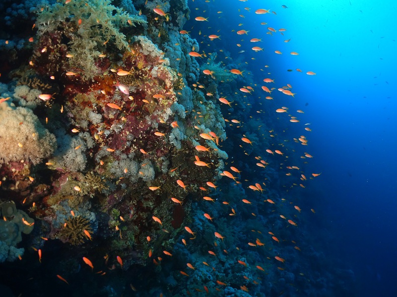 Natürlich besuchen wir auch die ungekrönte Prinzessin der Gegend: Elphinstone. Wohl aufgrund der Jahreszeit und auch der allgemeinen Lage sind wir das einzige Boot am Platz, nur drei Tauchgäste teilen sich den wundervollen Ort an diesem Tag. Am Nordplateau wuchert ein Märchenwald aus weißen, pinken und lila Weichkorallen zwischen denen orange Fahnenbarsche wie Schmetterlinge umherschweben, ein paar rote Juwelenbarsche kreuzen von links und rechts. Eine Explosion der Farben, die ganze Palette des Regenbogens im glasklaren durscheinenden Blau. Ein Napoleon knackt eine Muschel während ein kleineres Exemplar neben ihm herschwimmt. Eine Karettschildkröte betätigt sich als Gärtner und stutzt den üppigen Weichkorallenbewuchs. Die herrliche steile Wand entlang, der wir Richtung Süden folgen, begegnen uns Riesenmuränen, zitronengelbe Falterfische, grell rote Großaugenbarsche. Flötenfische tanzen, alle in dieselbe Richtung ausgerichtet, ein Ballett für uns. Am Ende der Wand finden wir das mit hellen Weichkorallen überwucherte Südplateau. Die ansonsten häufig zu Gast weilenden Weißspitzen Hochseehaie sind an diesem Tag allerdings abwesend. Trotz der Eiseskälte (es ist Jänner) wiederhole ich diesen Tauchgang insgesamt vier Mal.