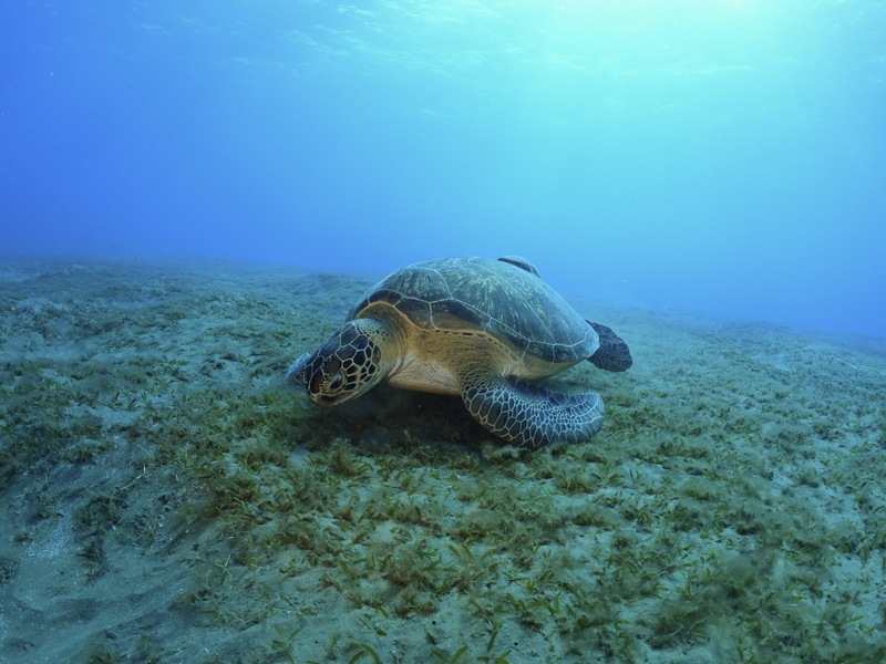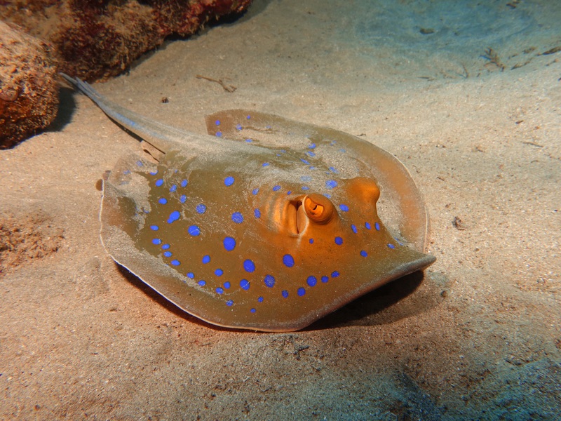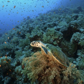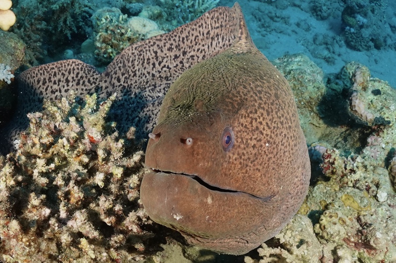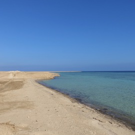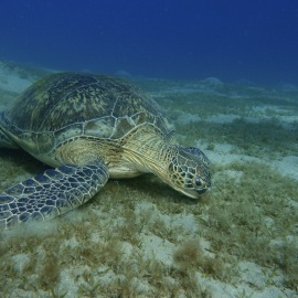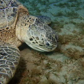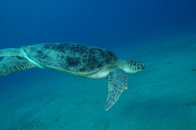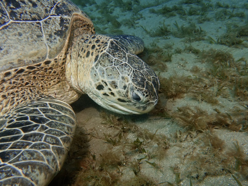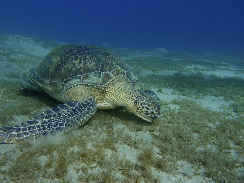 Marsa Alam, eine kleine Wüstenstadt im Süden Ägyptens, umgeben von zumeist grauenerregenden, riesigen Pauschalhotels, die in ziemlicher Entfernung zueinander liegen (eine Stunde Fahrzeit von Hotel zu Hotel oder von einer Marina zum Hotel ist keine Seltenheit). Die Berge, die am Sinai noch das Meer bedrängen, sind im Süden relativ weit in den Hintergrund gerückt. Ein paar Wadis mit buschartigen Gewächsen, die allesamt mit buntem Plastikmüll verhangen sind, dazwischen einige Hotels in Bau. Und wie so oft, liegt das Grauen und das Wunderschöne eng beisammen: Mein erster Tauchgang führt mich in die berühmte Abu Dabab Bucht (manchmal auch Abu Dabbab geschrieben), die selbst in Tourismus-Krisenzeiten relativ überlaufen wirkt. Die Bucht schirmt eine Seegraswiese mit dutzenden grünen Meeresschildkröten ab, die Tiere wirken geradezu riesig während sie energisch den Boden nach Seegrasstängeln abrupfen und gegenüber der Annäherung von Menschlein so gut wie unempfindlich sind. Ich habe noch nie eine solche Anzahl derart großer Tiere gesehen. Zwei Adlerrochen Kinder umschwimmen uns ebenso wenig scheu bei jedem Tauchgang in der Bucht. Die Riesenmuränen öffnen träge ihre Münder während Großmaulmakrelen in großen Schulen durchs Wasser pflügen. Auch nachts wird es spannend in der Bucht, winzige bunt schimmernde Sepien durchkreuzen den Lichtstrahl, Krabben sausen umher, die Äuglein von Geißelgarnelen blitzen auf wie Katzenaugen.