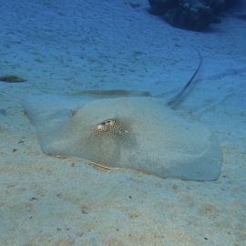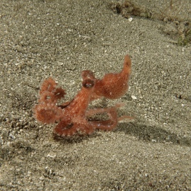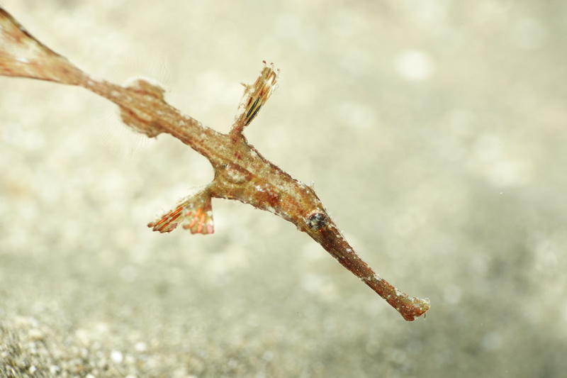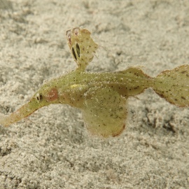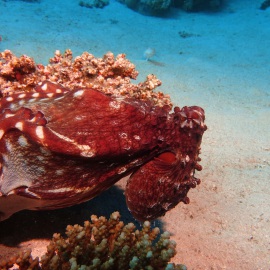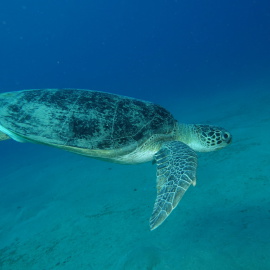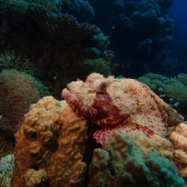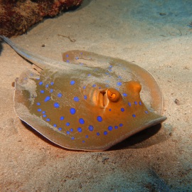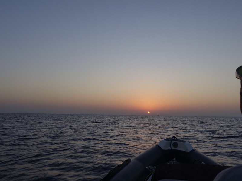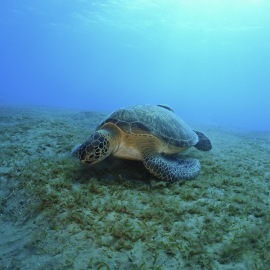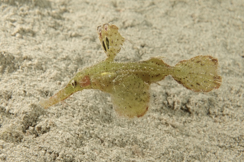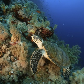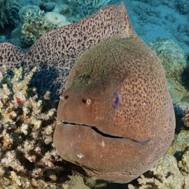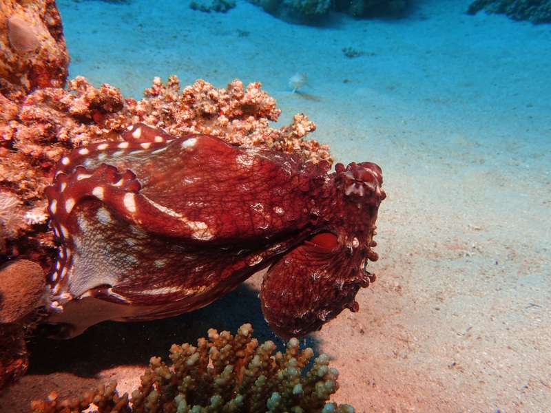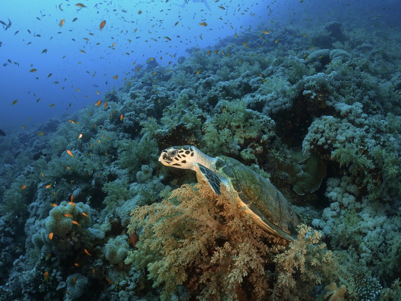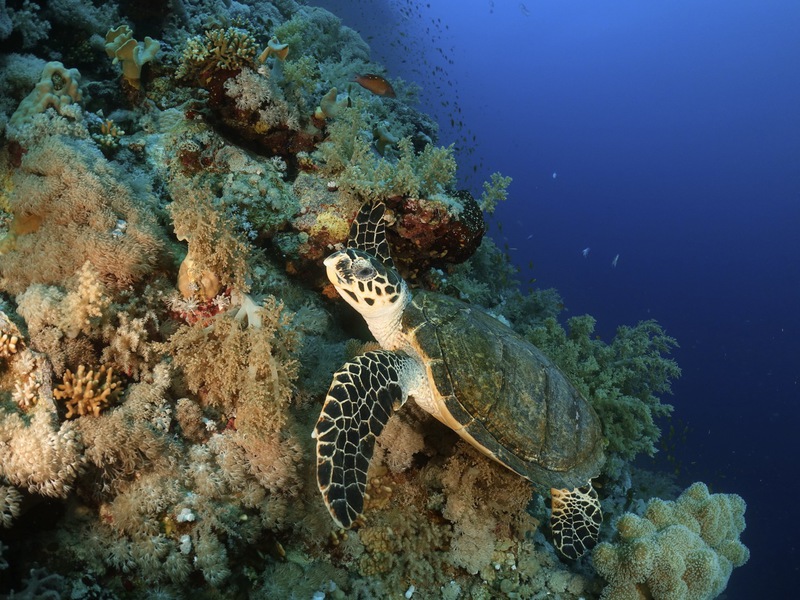 Marsa Alam, eine kleine Wüstenstadt im Süden Ägyptens, umgeben von zumeist grauenerregenden, riesigen Pauschalhotels, die in ziemlicher Entfernung zueinander liegen (eine Stunde Fahrzeit von Hotel zu Hotel oder von einer Marina zum Hotel ist keine Seltenheit). Die Berge, die am Sinai noch das Meer bedrängen, sind im Süden relativ weit in den Hintergrund gerückt. Ein paar Wadis mit buschartigen Gewächsen, die allesamt mit buntem Plastikmüll verhangen sind, dazwischen einige Hotels in Bau. Und wie so oft, liegt das Grauen und das Wunderschöne eng beisammen: Mein erster Tauchgang führt mich in die berühmte Abu Dabab Bucht (manchmal auch Abu Dabbab geschrieben), die selbst in Tourismus-Krisenzeiten relativ überlaufen wirkt. Die Bucht schirmt eine Seegraswiese mit dutzenden grünen Meeresschildkröten ab, die Tiere wirken geradezu riesig während sie energisch den Boden nach Seegrasstängeln abrupfen und gegenüber der Annäherung von Menschlein so gut wie unempfindlich sind. Ich habe noch nie eine solche Anzahl derart großer Tiere gesehen. Zwei Adlerrochen Kinder umschwimmen uns ebenso wenig scheu bei jedem Tauchgang in der Bucht. Die Riesenmuränen öffnen träge ihre Münder während Großmaulmakrelen in großen Schulen durchs Wasser pflügen. Auch nachts wird es spannend in der Bucht, winzige bunt schimmernde Sepien durchkreuzen den Lichtstrahl, Krabben sausen umher, die Äuglein von Geißelgarnelen blitzen auf wie Katzenaugen.
