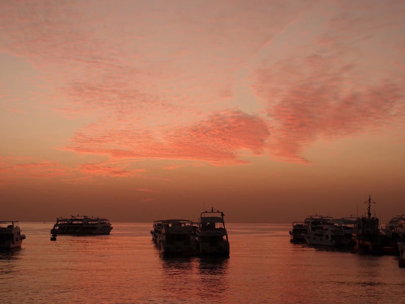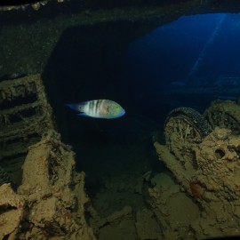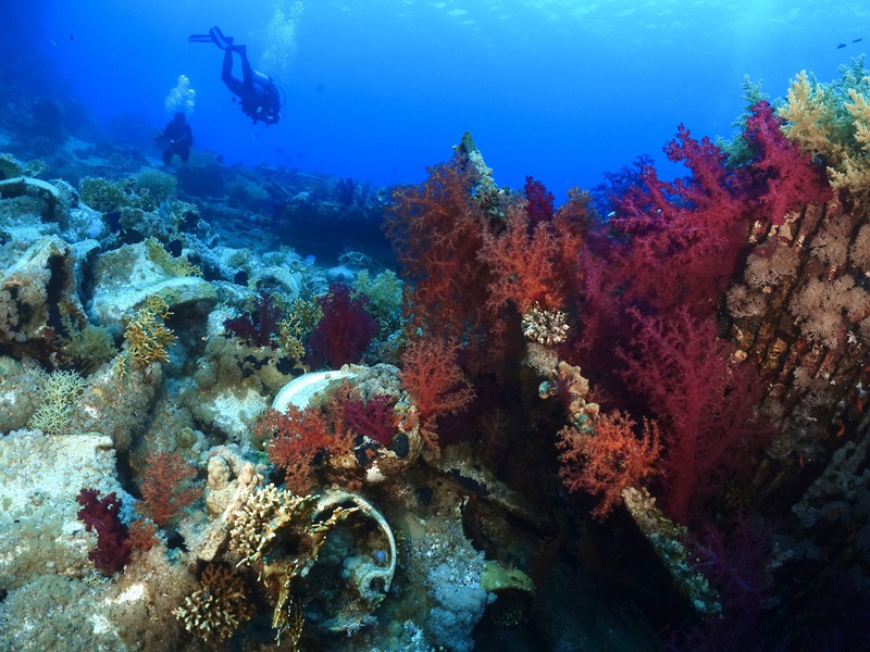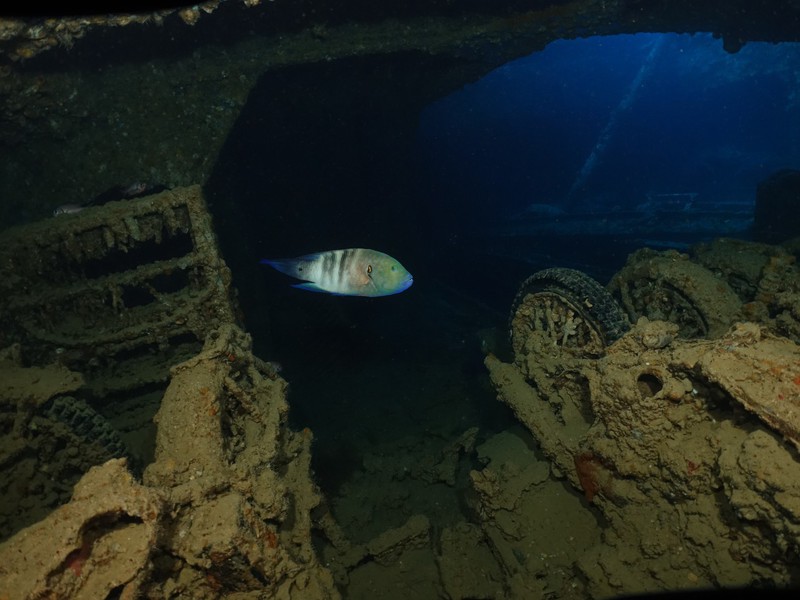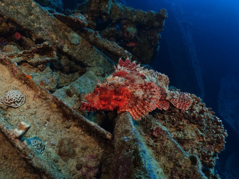 Bei den Tauchgängen am Wrack der SS Thistlegorm nordwestlich von Ras Mohammed beschleicht mich hingegen ein seltsames Gefühl während ich die Innenräume des riesigen, englischen Transportschiffes durchtauche, das 1941 von den Deutschen abgeschossen wurde. Die Waggons, die geladenen Motorräder, die Autos, die Munition hinterlassen einen beängstigend realen Eindruck, sodass sich mein Herz zu meinem eigenen Erstaunen kurz vor Schrecken weitet. Lediglich die riesigen zerfetzten Stiefel kaufe ich ihnen nicht ab, ich halte es für schlichtweg unvorstellbar, dass diese seit fast 80 Jahren so gut wie unverrottet am Meeresgrund liegen sollten - ich gehe davon aus, dass diese irgendjemand nachträglich am Wrack platziert hat (auch wenn mein Guide versichert, diese wären schon immer da gewesen). Dennoch verursacht mir das Wrack das seltsame Gefühl einer eindringlichen, intensiven Realität; die dramatischen Ereignisse des 6. Oktober 1941 scheinen fast greifbar, eine Wirklichkeit, die mir - für mich völlig unerwartet - durch Haut und Knochen dringt. In einem umso seltsameren Gegensatz dazu steht das Meeresleben am Wrack, das ganz gelassen so tut, als wäre es völlig normal, dass all dies hier am Meeresgrund liegt. Skorpionsfische dösen auf altem Metall, Fledermausfische und Makrelen umschwärmen den gewaltigen Bug, eine Schildkröte hat einen der Aufenthaltsräume des alten Kriegsschiffes als Wohnung auserkoren, Krokodilsfische liegen am Oberdeck als wären sie hier als Matrosen angestellt. Eine neue eigenartige Mannschaft von Meereskreaturen steuert nun scheinbar das gewaltige alte englische Schiff. Der Krieg ist längst vorüber, scheinen sie sagen zu wollen.