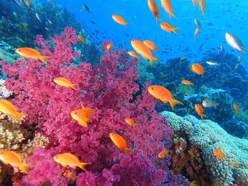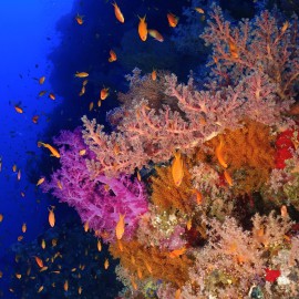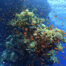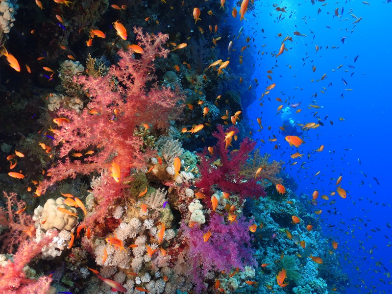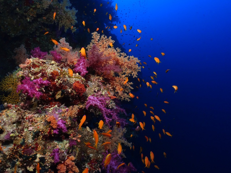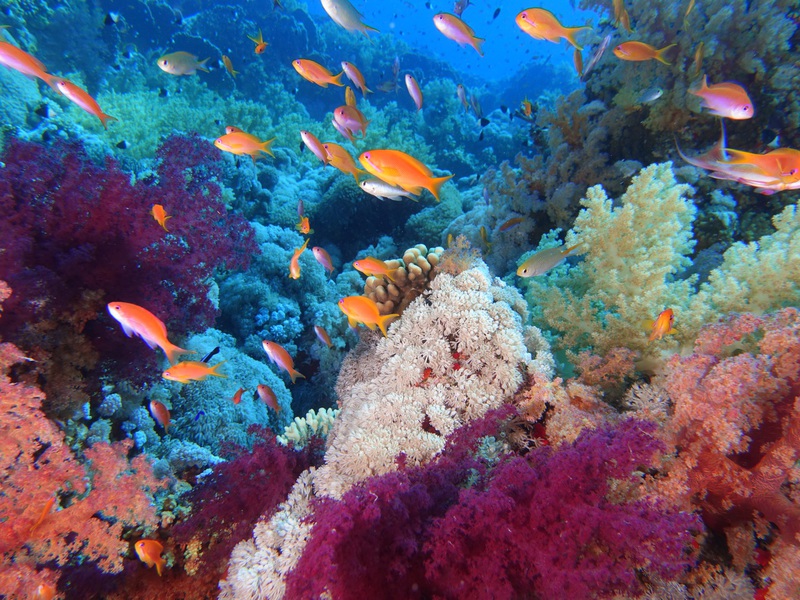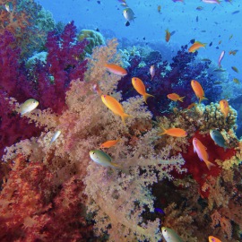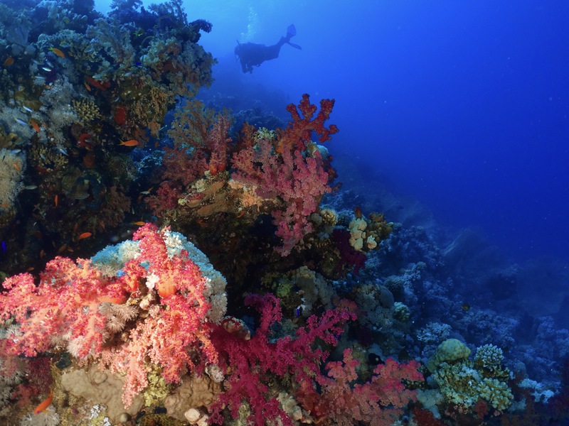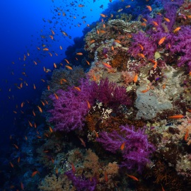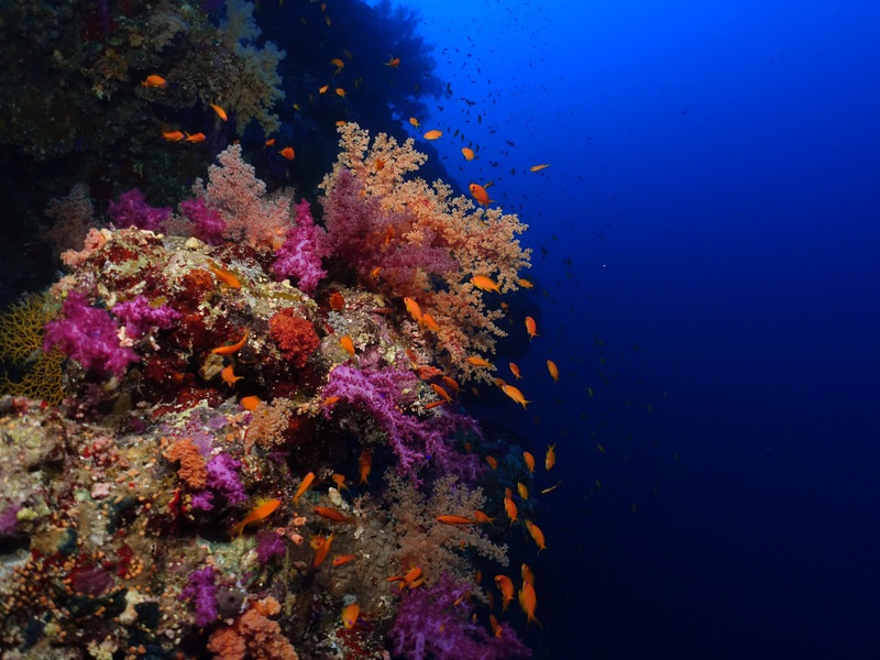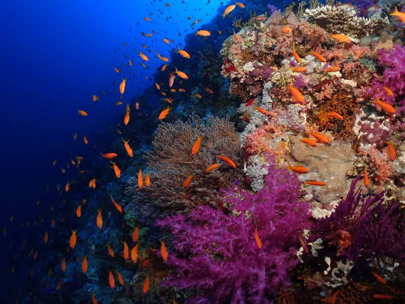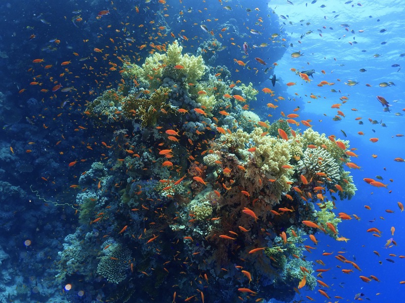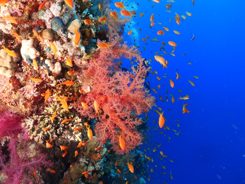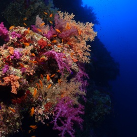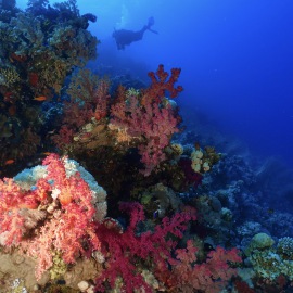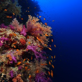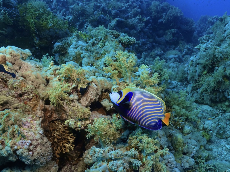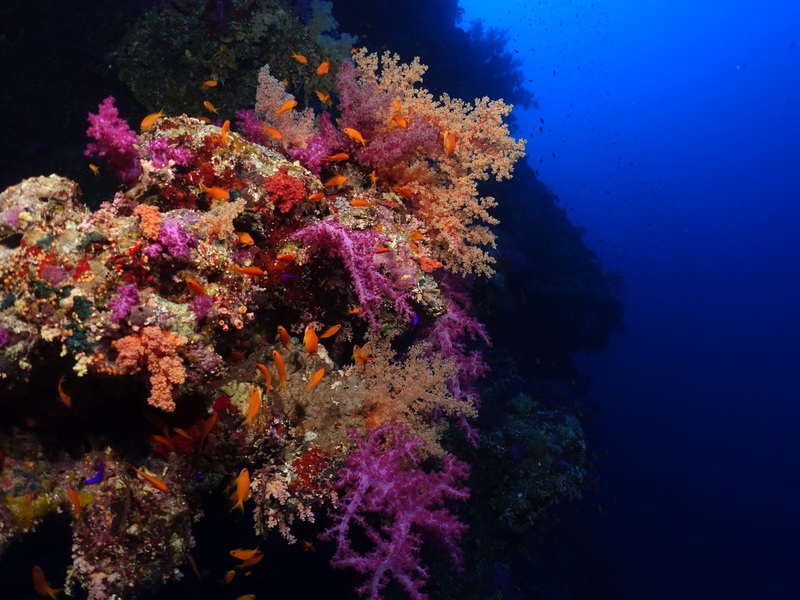 Bei Ras Mohammed stürzt ockerbraunes Land teils in steilen Klippen in die tiefblaue See. Unter Wasser setzt sich der senkrechte Sturz der Landmassen nach unten fort, allerdings verwandeln sich die ockerbraunen Klippen unter der Wasseroberfläche in grelle pink und rosarot bewachsene Steilwände, die ins Unendliche abzufallen scheinen und auf denen zwischen buntem Weichkorallenbewuchs tausende orange Fahnenbarsche umher schwirren. Ein fantastisches, farbiges, bewegtes Spektakel, das die Sinne fesselt und einem buchstäblich den Atem raubt während einen die leichte Strömung die Wand entlang treibt. Ein Juwelenzackenbarsch wirft mir einen leicht angenervten Blick zu und rollt mit den Augen während er in sicherem Abstand um mich herum kurvt. Ein Napoleon überlegt kurz, ob die runden weißen Abdeckungen meiner Blitzlichter hartgekochte Eier sein könnten und wirft begehrliche Blicke darauf während er sich nähert, versteht aber bedauerlicherweise recht schnell, dass es sich hier nur um Blendwerk handelt und sucht das Weite, nachdem er die Blitze kurz begutachtet hatte. Beim Yolanda Reef setzt die leichte Strömung, die einen sanft, aber bestimmt das Shark Reef entlang geführt hat, mit einem Mal aus und bedeutet einem, dass man nun am Ende dieser kurzen Reise angelangt ist. Weiße Weichkorallen wuchern über die noch vorhandenen Reste des Wracks. Zwei Krokodilsfische sitzen auf einer der hier herumliegenden Toilettenschüsseln. Arabische Kaiserfische kreuzen durch die Reste des ansonsten - in unerreichbarer Tiefe - verschwundenen Wracks. So viel Leben! Es ist kaum alles zu erfassen.
