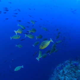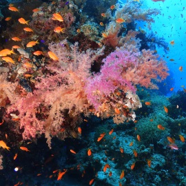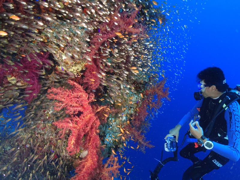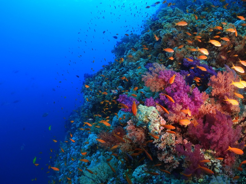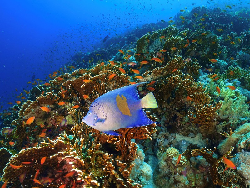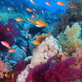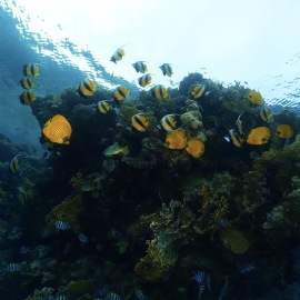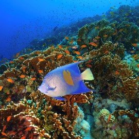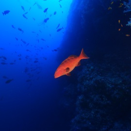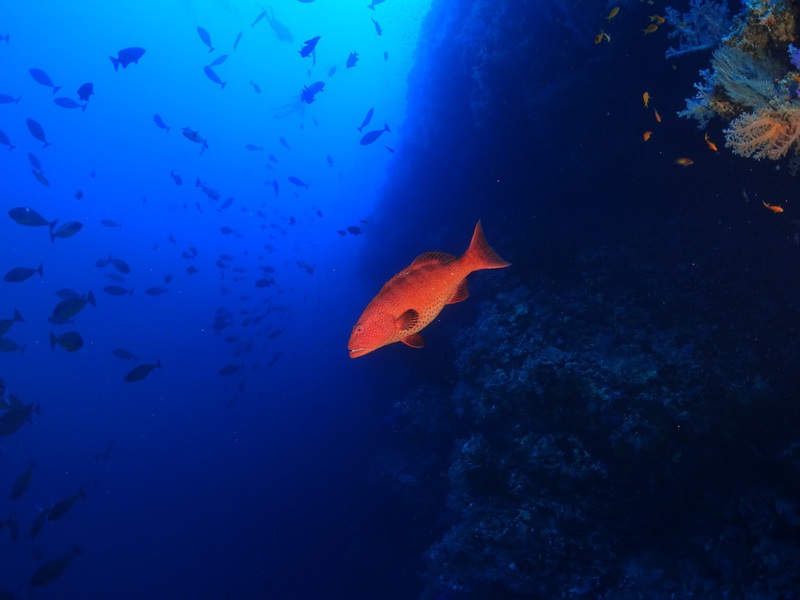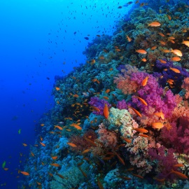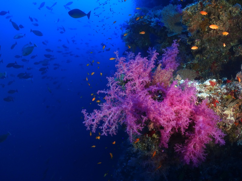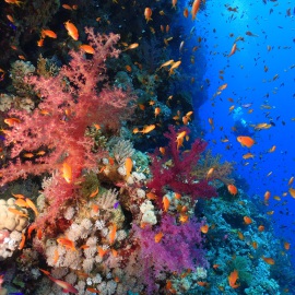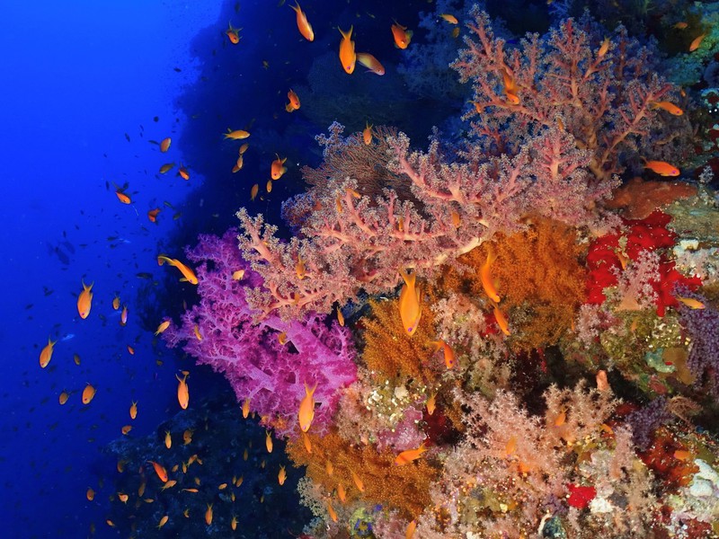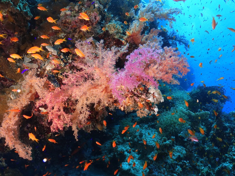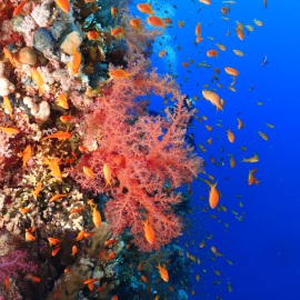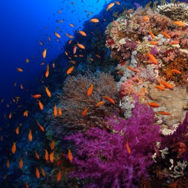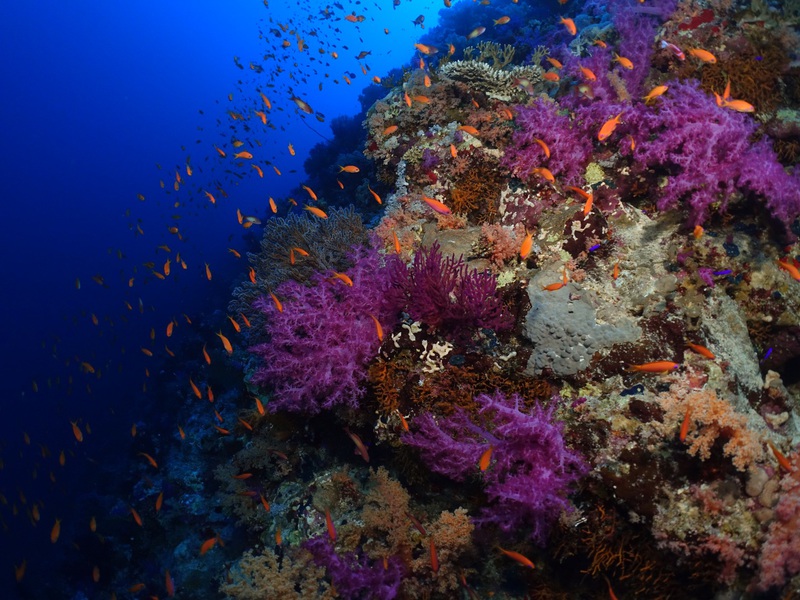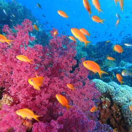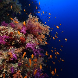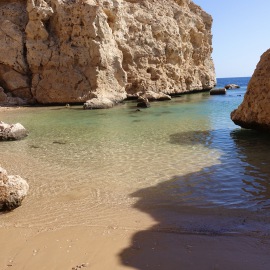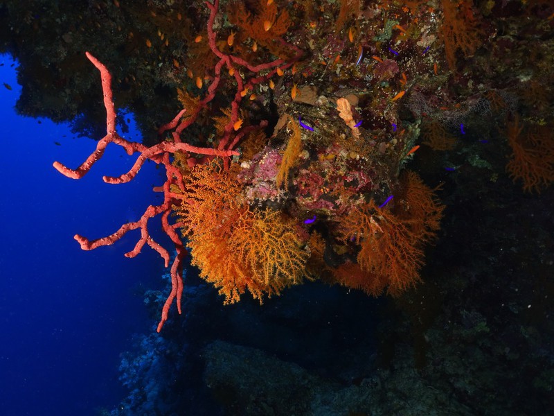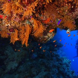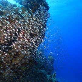 Bei Ras Mohammed stürzt ockerbraunes Land teils in steilen Klippen in die tiefblaue See. Unter Wasser setzt sich der senkrechte Sturz der Landmassen nach unten fort, allerdings verwandeln sich die ockerbraunen Klippen unter der Wasseroberfläche in grelle pink und rosarot bewachsene Steilwände, die ins Unendliche abzufallen scheinen und auf denen zwischen buntem Weichkorallenbewuchs tausende orange Fahnenbarsche umher schwirren. Ein fantastisches, farbiges, bewegtes Spektakel, das die Sinne fesselt und einem buchstäblich den Atem raubt während einen die leichte Strömung die Wand entlang treibt. Ein Juwelenzackenbarsch wirft mir einen leicht angenervten Blick zu und rollt mit den Augen während er in sicherem Abstand um mich herum kurvt. Ein Napoleon überlegt kurz, ob die runden weißen Abdeckungen meiner Blitzlichter hartgekochte Eier sein könnten und wirft begehrliche Blicke darauf während er sich nähert, versteht aber bedauerlicherweise recht schnell, dass es sich hier nur um Blendwerk handelt und sucht das Weite, nachdem er die Blitze kurz begutachtet hatte. Beim Yolanda Reef setzt die leichte Strömung, die einen sanft, aber bestimmt das Shark Reef entlang geführt hat, mit einem Mal aus und bedeutet einem, dass man nun am Ende dieser kurzen Reise angelangt ist. Weiße Weichkorallen wuchern über die noch vorhandenen Reste des Wracks. Zwei Krokodilsfische sitzen auf einer der hier herumliegenden Toilettenschüsseln. Arabische Kaiserfische kreuzen durch die Reste des ansonsten - in unerreichbarer Tiefe - verschwundenen Wracks. So viel Leben! Es ist kaum alles zu erfassen.