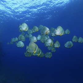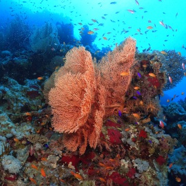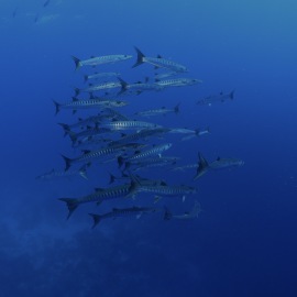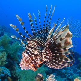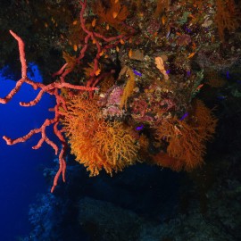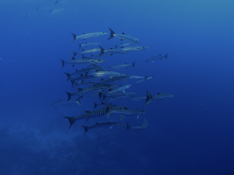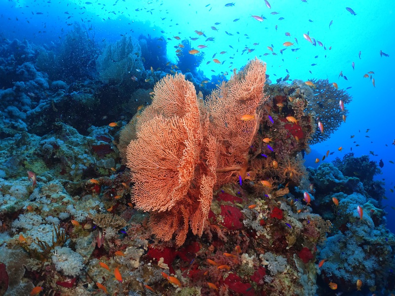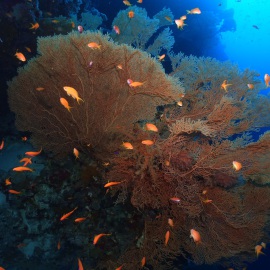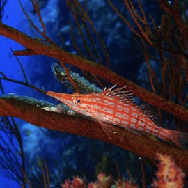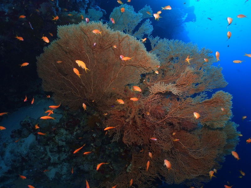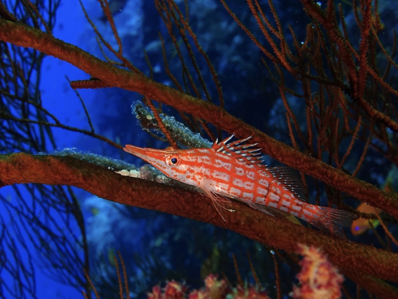 Haie sehe ich diesmal nur bei Ras Umm Sid, wo etwa ein trächtiges Weißspitzenriffhaiweibchen regelmäßig bei einem tiefergelegenen Plateau mit Gorgonienfächern anzutreffen ist, ebenso wie der ortstreue Barrakudaschwarm und einige Napoleons. Der Tauchgang vom Fanar Beach aus mit sehr bequemen Einstieg ist sicherlich einer der schönsten Landtauchgänge, die man hier unternehmen kann und bereits hier bieten sich spektakuläre Gorgonienwälder mit zahlreichen possierlichen Langnasenbüschelbarschen, die in ihrer rot-weiß karierten Tracht in den Gorgonien hocken.